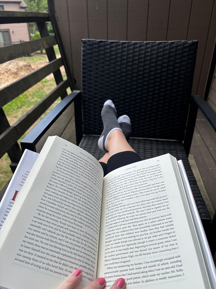 This was my first time reading out on the balcony this year! Between roof construction and pollen, I waited to bring up the chairs. I’m still reading Lovely One.
