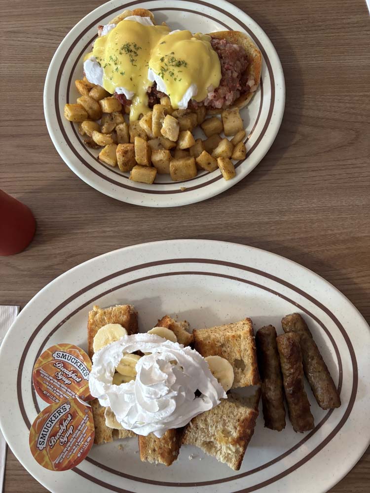 Breakfast: The Breakfast Room. This was definitely a mom and pop place, which are our favorite breakfast restaurants. The decor was strong country vibes. I think the owner was the one who waited on us, and she was saying hi to all of the regulars/locals while we were there. Josh got the Irish eggs Benedict, and I got banana bread French toast. Both were so good!