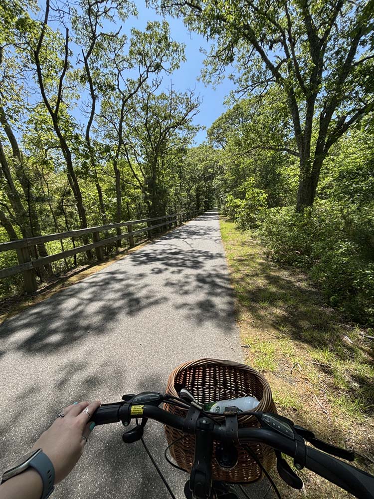 The guy at the shop was great and easily got us set up with bikes, baskets, and helmets, and we were on our way. We ended up going seven miles out and seven miles back in just under two hours. I didn’t want to go out too far, and I had to use my inhaler, especially because of a few hills (there was a bridge that went up over a highway). We had perfect weather for the ride: sunny, slightly breezy, and around 70 degrees. And no sunburns!