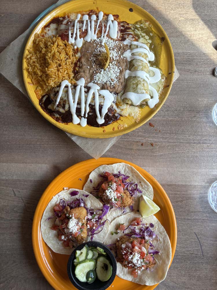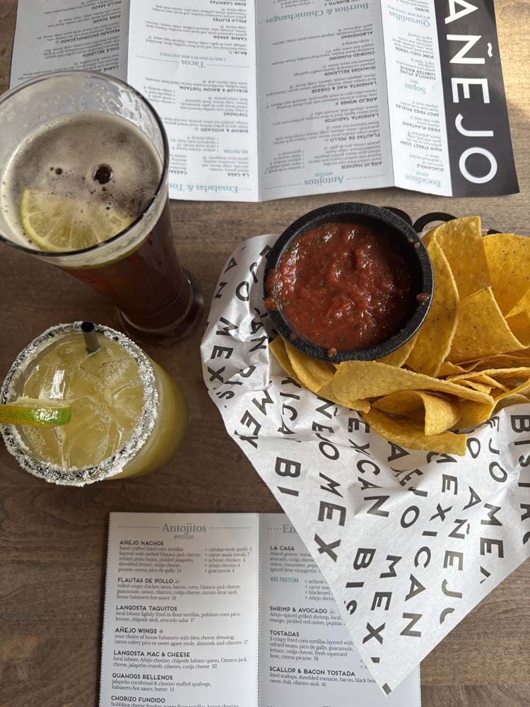Dinner: Anejo. This was a cute Mexican restaurant in downtown Hyannis! We got there after 5:00 p.m. and easily got a table inside. I got a mango margarita, and Josh got a Dos Equis beer. For dinner, I got fish tacos, and Josh got a variety of enchiladas; we were also brought some chips and salsa to snack on.