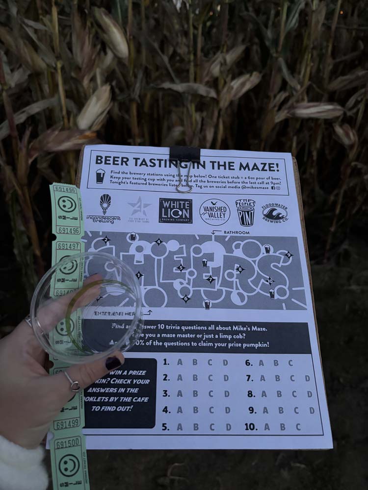This is one of our annual traditions: Mike’s Maze Beer Tasting! My friend, Alex, and our favorite third wheel joined us; it’s funny because Alex and I are both rather short, so Josh is responsible for not losing either of us in the corn maze. In the maze, six local breweries are set up where you can get a tasting at each one, and there are also trivia questions throughout. The theme this year was Mike’s Maze’s 25th anniversary. We did a lot better with the trivia this year—I think we got seven out of ten correct—and we each got a tiny prize pumpkin.