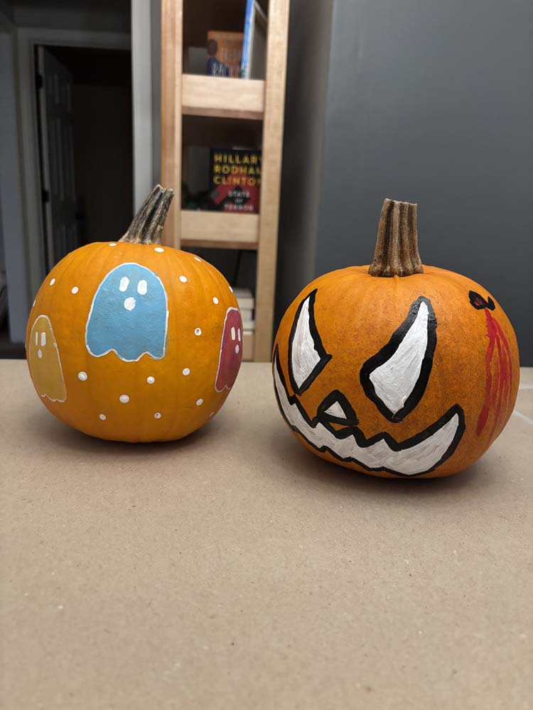 We didn’t have time over the weekend to paint our pumpkins, but we got around to it one weeknight after Josh got home from work. I think you can tell who painted which pumpkin… 😂