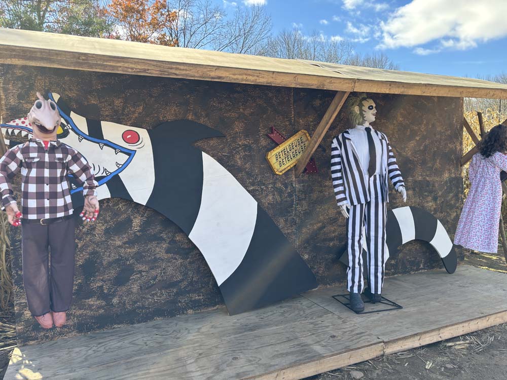 This wasn’t on our initial plans, but Josh and I crashed his sister, their parents, and our niece’s outing to a local orchard/bakery/small farm/ice cream place. We all went through the corn maze in the back that was spooky themed; there were five big set ups throughout the maze, including one for Stranger Things (left) and Bettlejuice (right). The other ones were for The Addams Family, The Nightmare Before Christmas, and Ghost Busters.