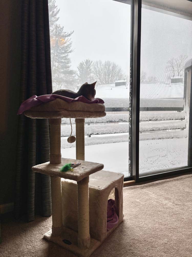 New England continues to get more snow, and it’s never going to melt. Earlier this week, we had a blizzard that dropped probably 8-9 inches in town, on top of whatever was already left over from the snowstorm at the end of January. We’re going to be buried until the summer. But Cannoli loves her new tower we got her and spent most of the day watching the snow.